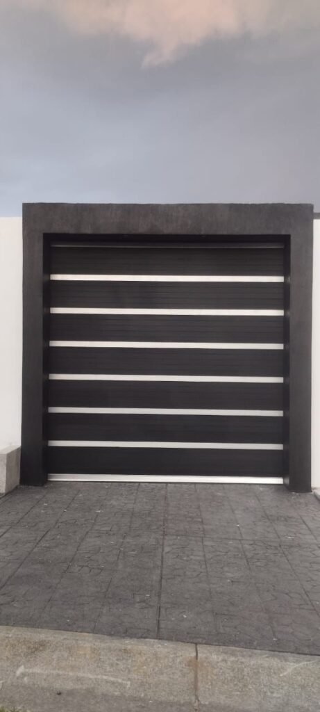 Es una puerta metálica o de aluminio que se enrolla sobre sí misma hacia arriba, accionada por un motor eléctrico que permite abrirla y cerrarla con solo presionar un botón o desde un control remoto.